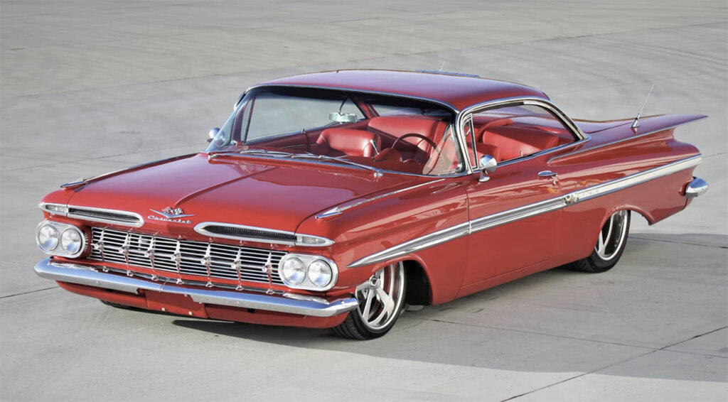 By 1959, the Chevrolet Impala underwent a redesign as part of a cost-saving measure by General Motors. The new design involved sharing bodyshells with lower-end Buicks, Oldsmobiles, and Pontiacs. With the introduction of a new X-frame chassis, the Impala saw a lower roofline by 3 inches, increased body width by 2 inches, a longer wheelbase by 1-1/2 inches, and a higher curb weight. The tailfins were flattened and extended outward instead of upward, while the taillights featured a large “teardrop” design. Nonfunctional front air intake scoops were added above the grille.